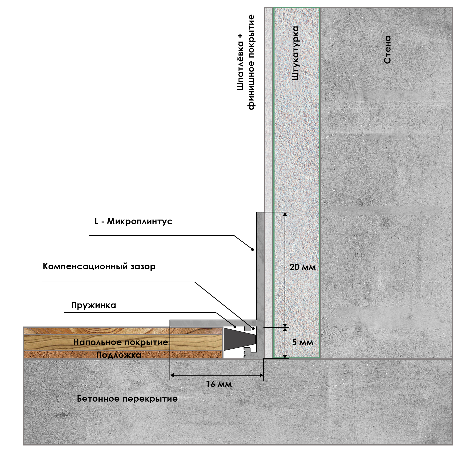 Микроплинтус щелевой МП-02 для установки в зазор между стеной и полом. Пружинки позволяют плавающему полу компенсировать линейные расширения и не деформироваться.
